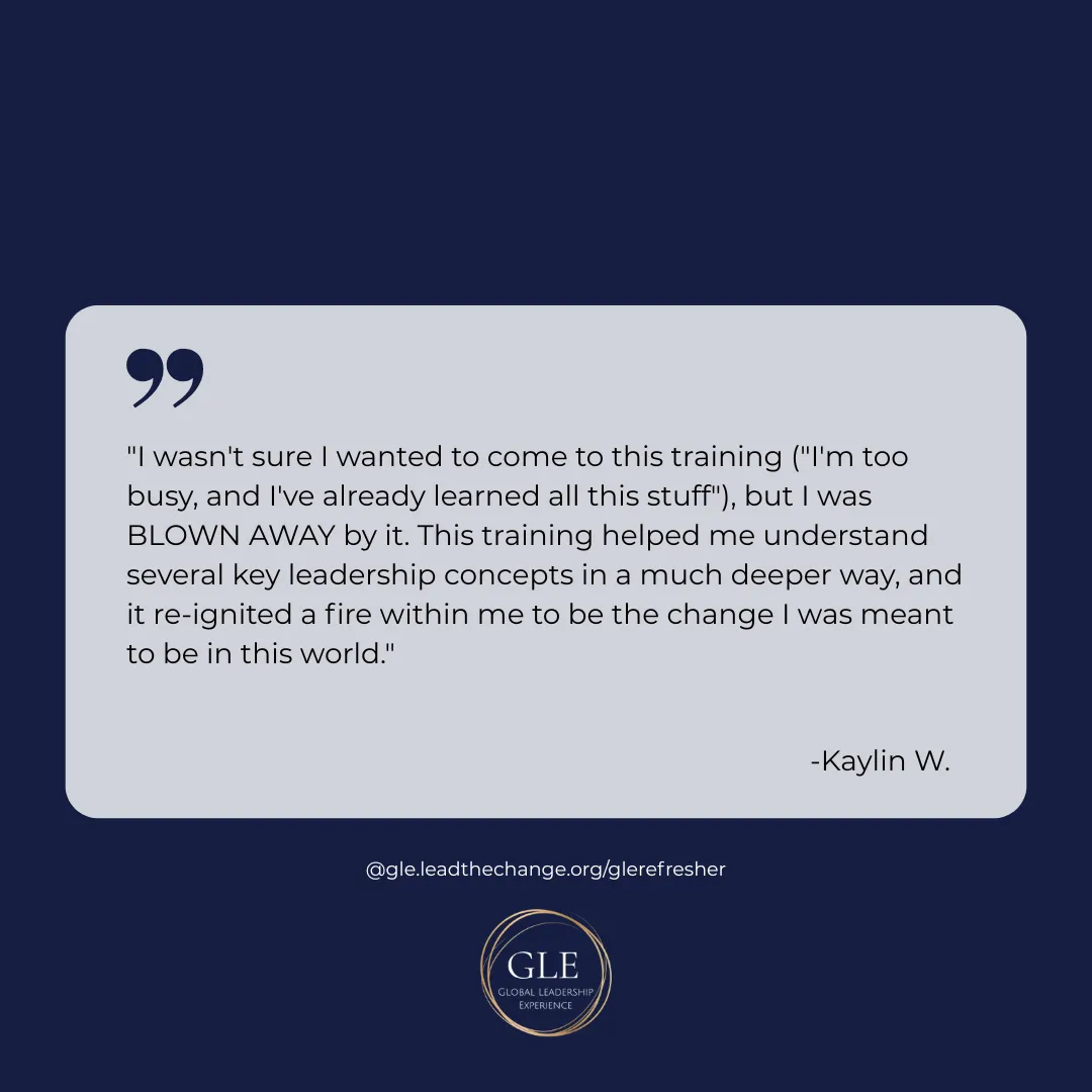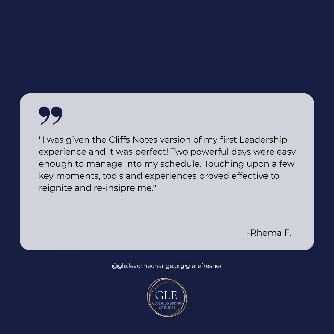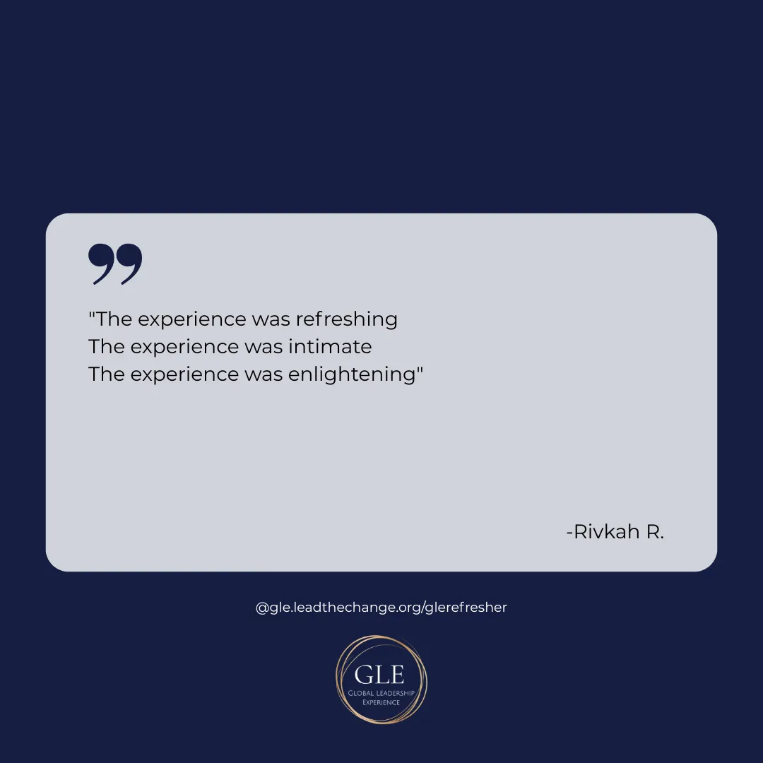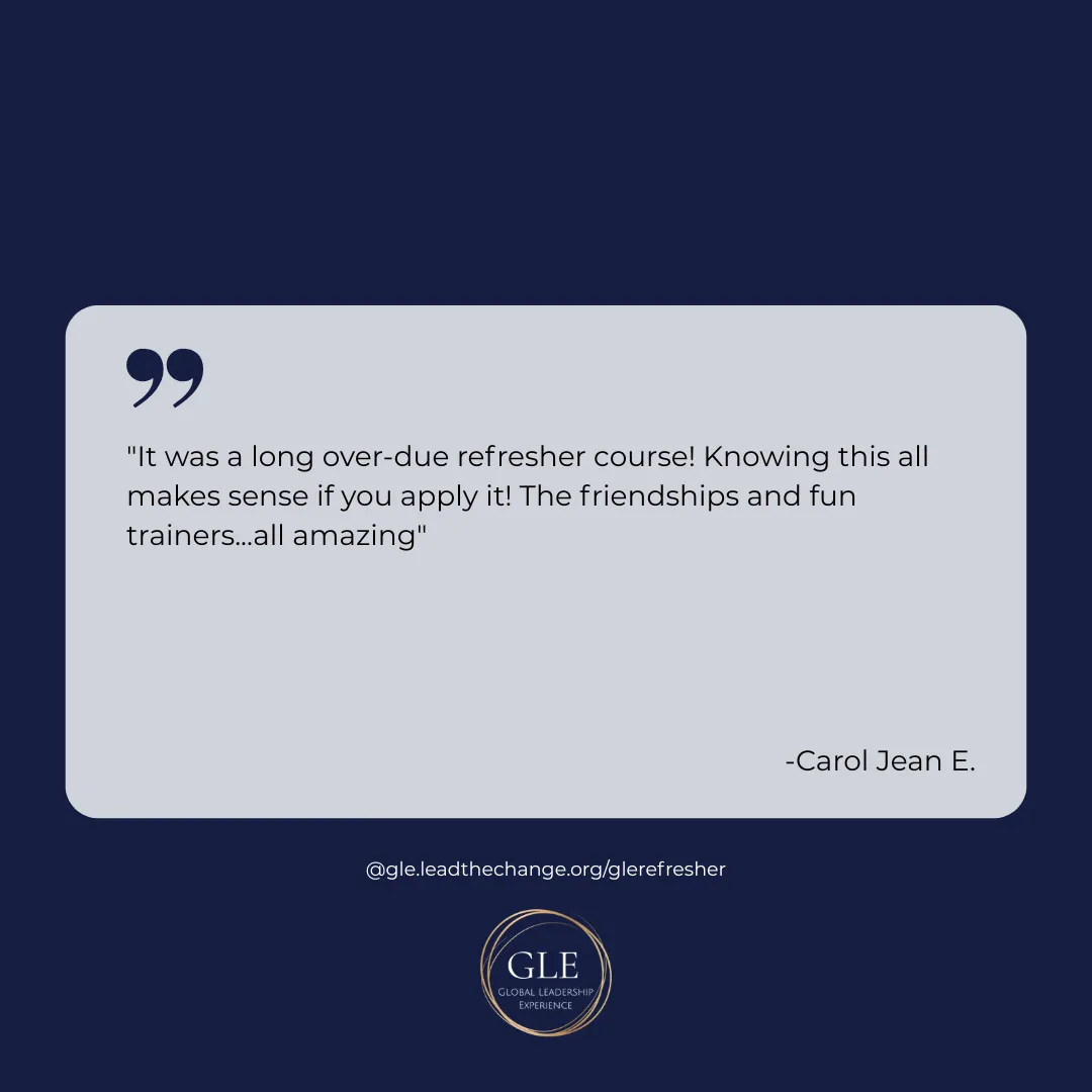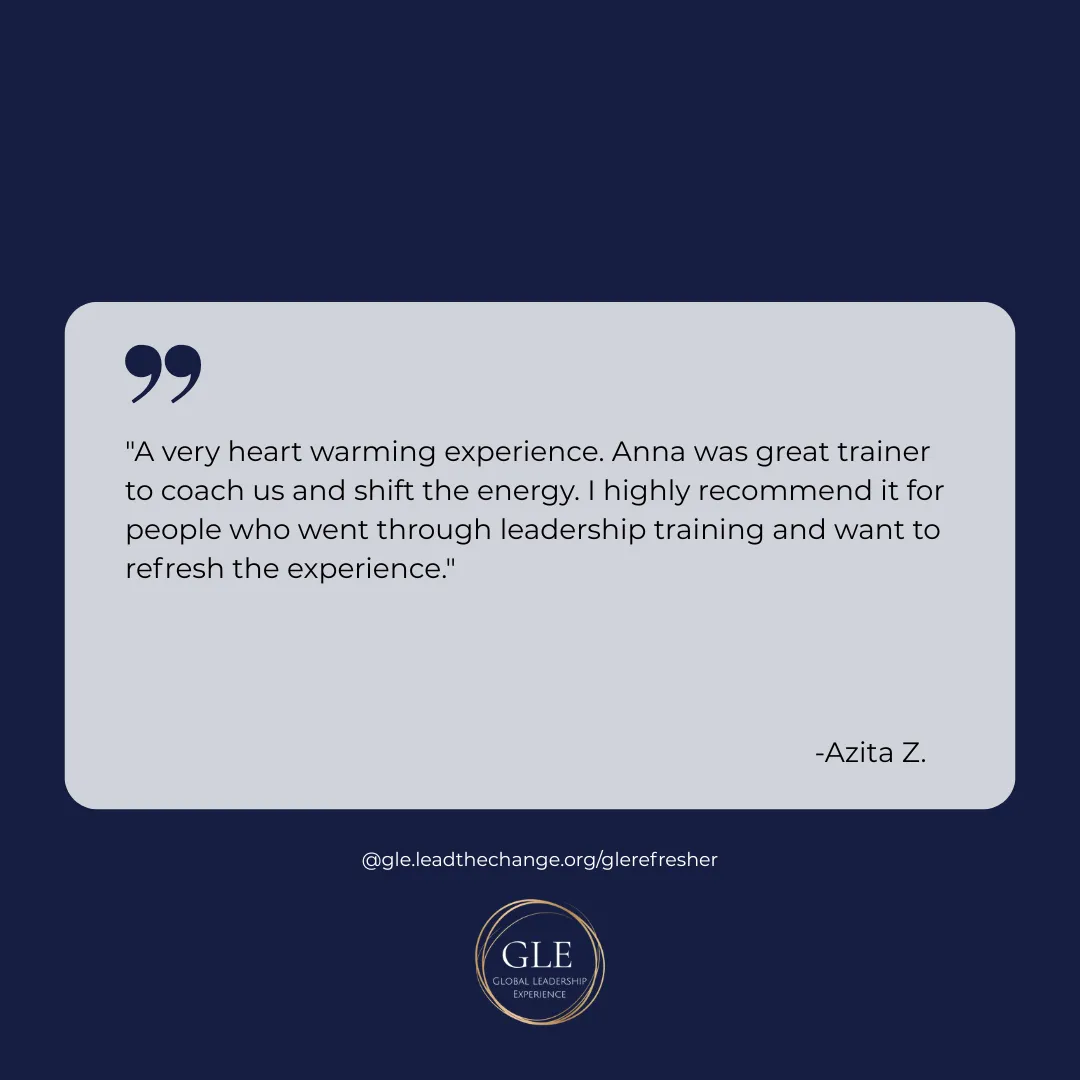 The Global Leadership Experience Leadership Refresher is designed exclusively for graduates of transformational leadership programs who are ready to deepen their clarity, strengthen their leadership, and fully embody their vision in life, work, and relationships.